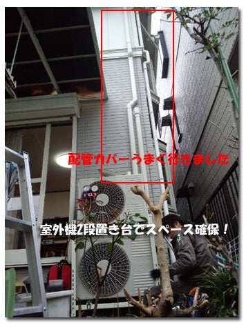 エアコンは1階と2階にありますのでそれぞれに配管し2段置き台に乗せた室外機につないで完成です。