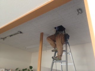 朝から事務所内照明器具の取り付けです。今回ももちろんLED40×2灯用器具です。