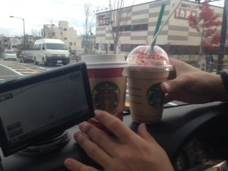今日のブレイクタイムはスターバックスのコーヒー。香りが車の中充満ですね~。